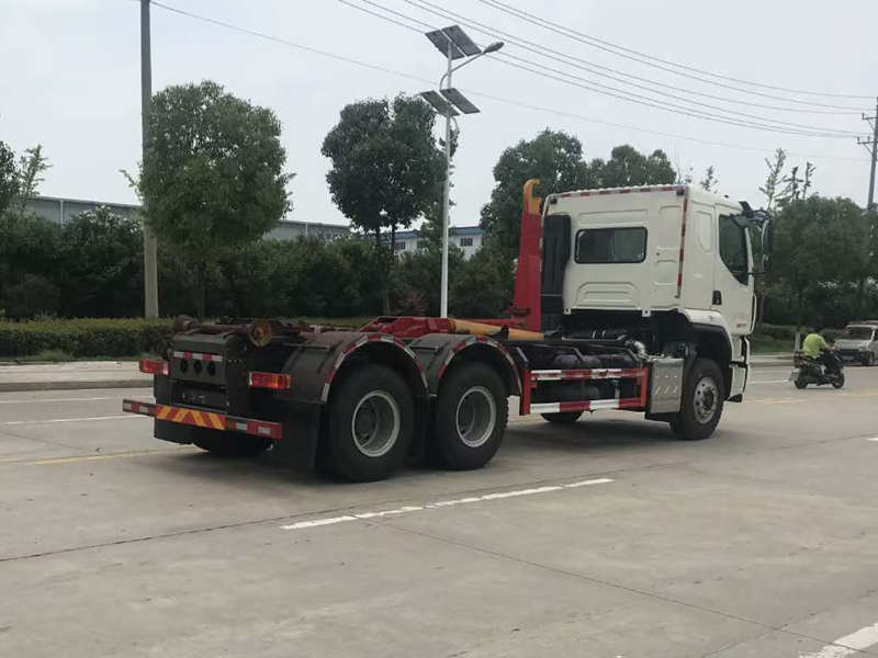 上裝配置:】勾起能力20T,設備自重2400Kg,鉤臂伸縮量1000mm,鉤箱時間45S,鉤心高度1570mm,鉤心到后滾輪距離5275mm,拉臂鉤結構件Q460高強鋼Q345低合金高強鋼,該車是由汽車底盤、拉臂主油缸、附車架、翻轉架、支撐腿(選裝)、鎖緊架、鎖緊油缸及多路換向閥等組成。